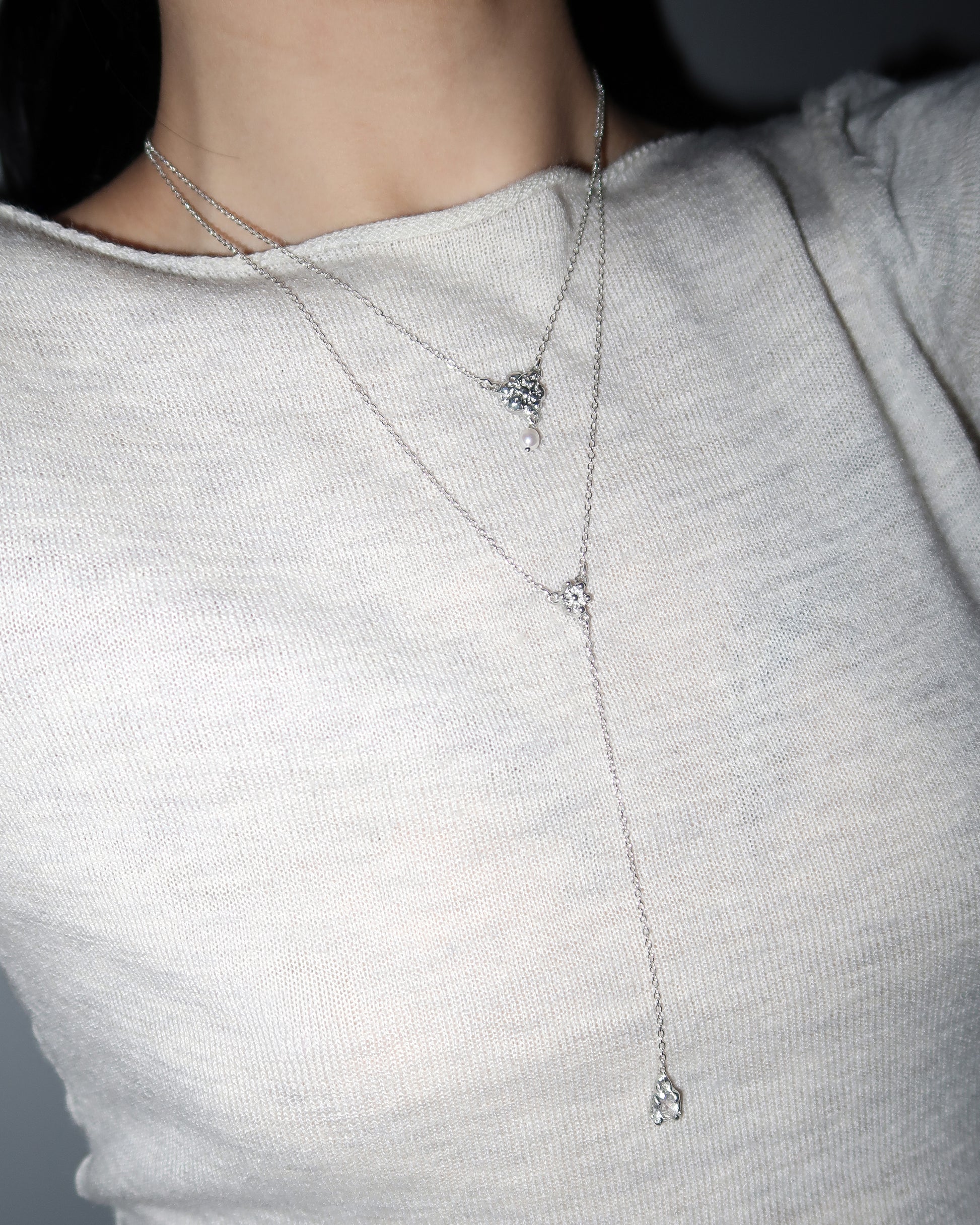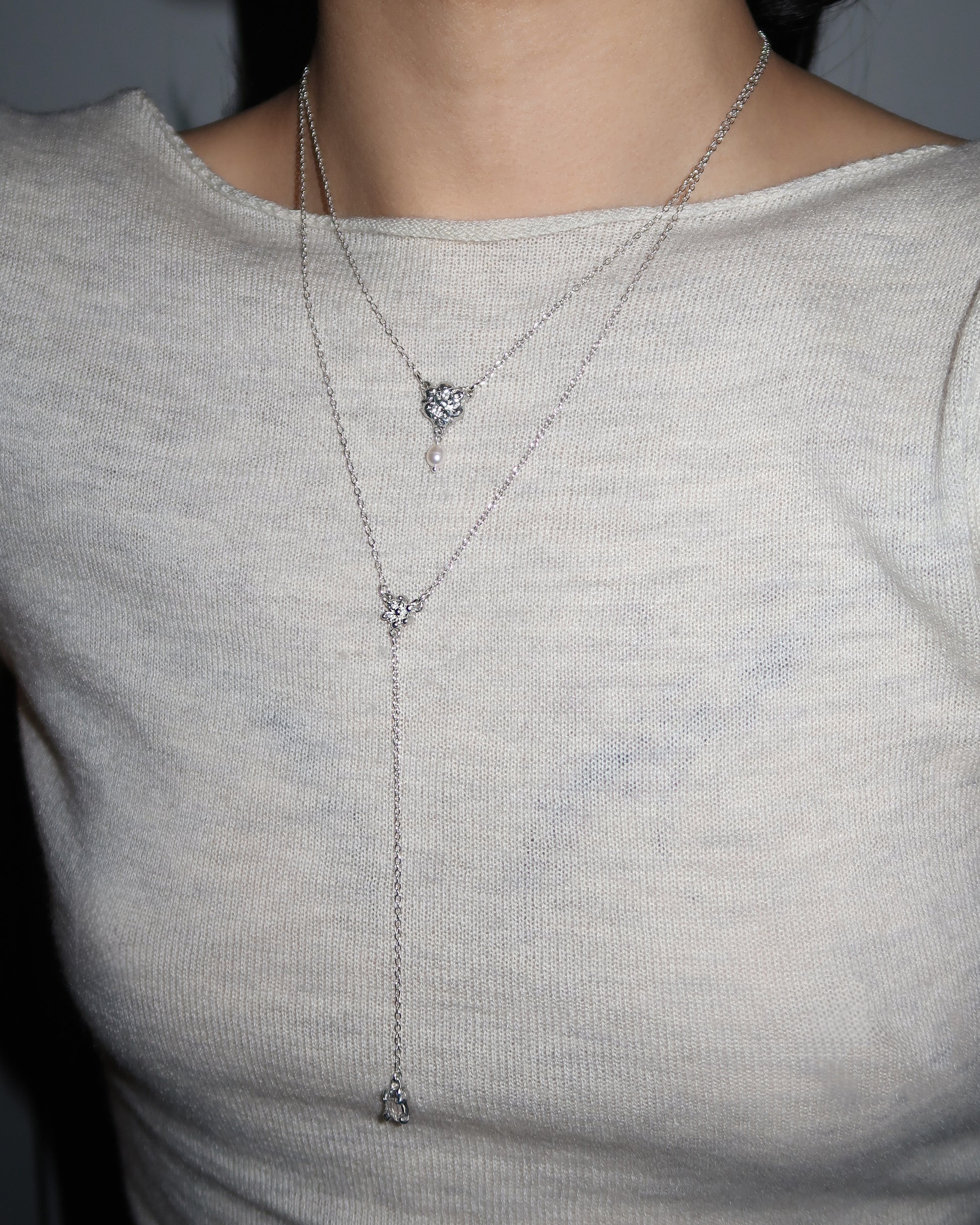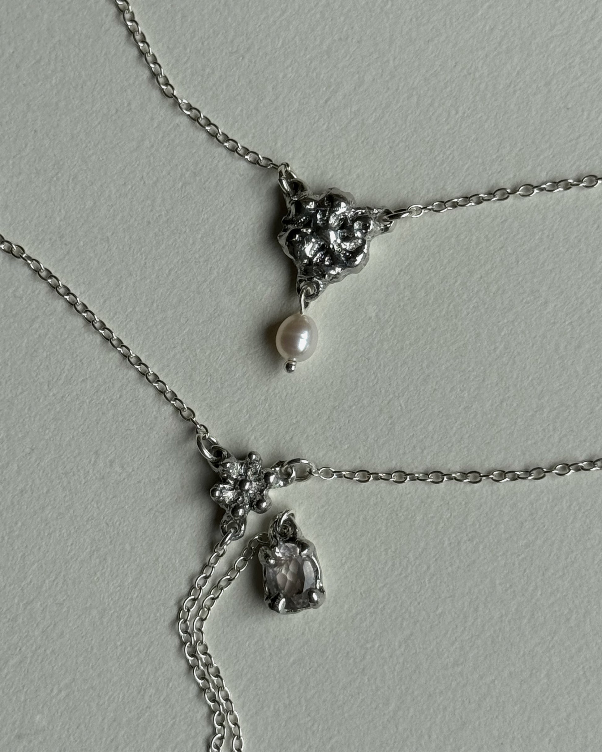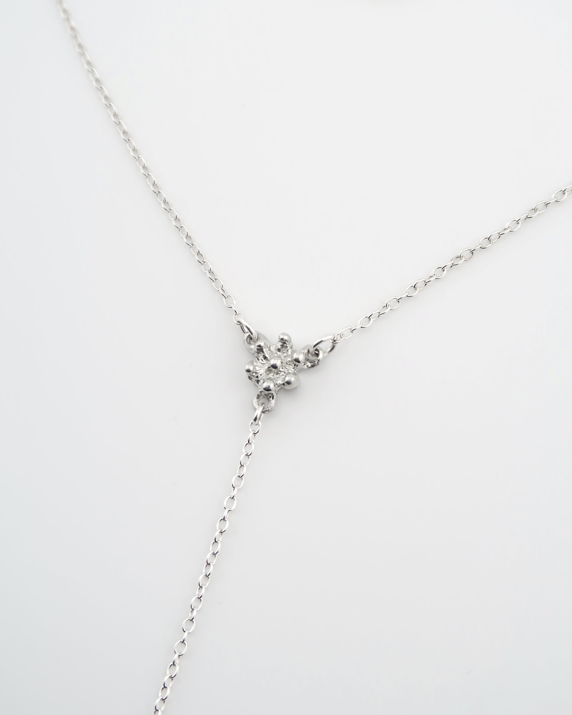 handmade pewter floral necklace with freshwater pearl and rose quartz